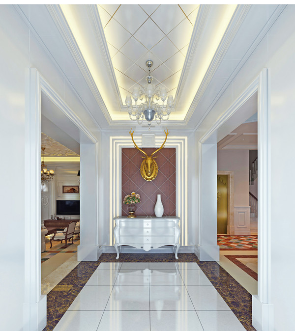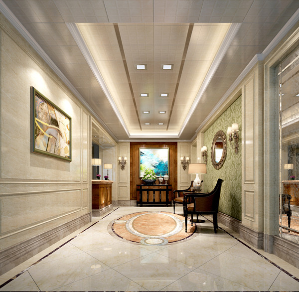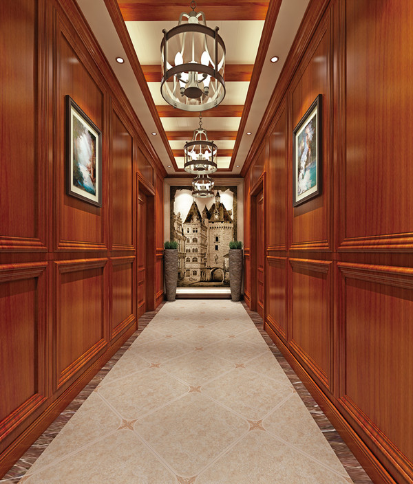一般室內過道的上方會有梁,所以我們一般都是選擇有吊頂的處理方式。吊頂宜簡潔流程,圖案以能體現韻律和節奏的線性為主,橫向為佳。吊頂要和燈光的設計協調,頂面盡量用清淺的顏色,不要造成凌亂和壓抑之感。